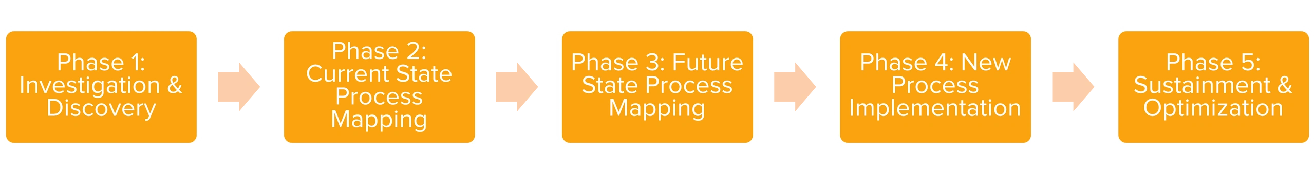 We use many tools and adapt approaches to suit your company and your project best. However, we often stick to 5 major phases for process improvement projects as shown in the graphic below.